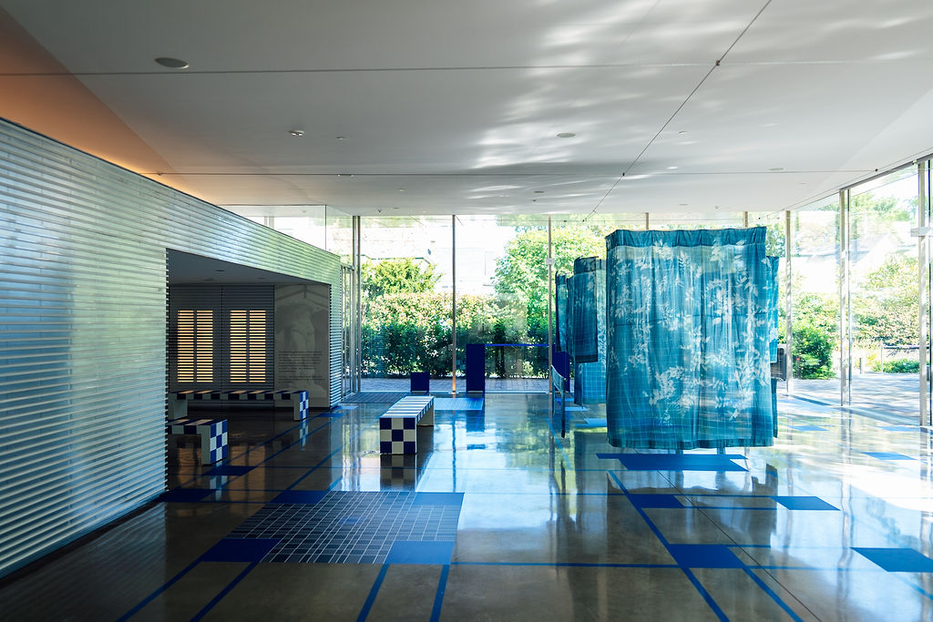 The site-specific installation reimagines how Wright’s symphony of constructed rhythms alchemizes light into an ethereal, ephemeral, even spiritual experience. Concepcion’s work responds to the spatial strategies and design gestures the architect implemented at Martin House, most notably the central fireplace. The installation is anchored by the Martin House hearth, the beating heart of the home and what Wright believed to be a portal linking his buildings to earth and sky. Concepcion immerses the audience into her composition by combining cyanotype printed textiles with the enveloping motif of a Martin House original blueprint.